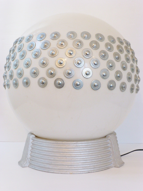 Etat correct, nombreuses traces et rayures d'usage sur la boule en plexiglas blanc, accidents sur le rebord inférieur de la base en plâtre. Disques en métal en bon état.