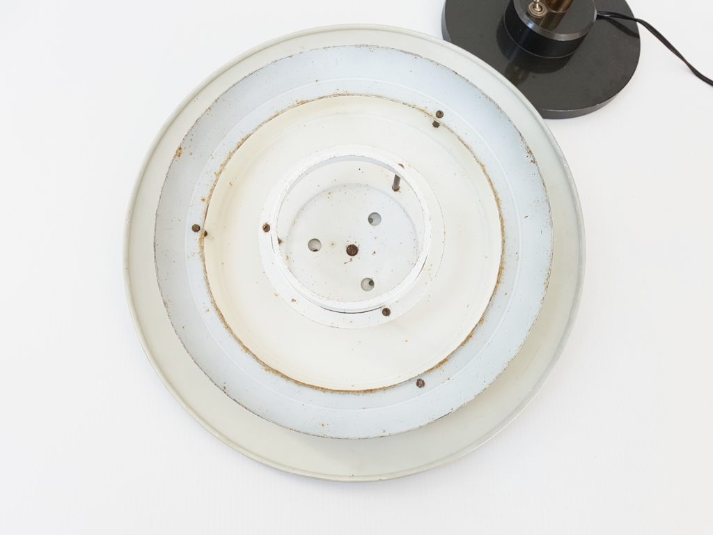 Bon état général, oxydation à l'arrière du double réflecteur qui est légèrement voilé : voir photos. Fonctionne parfaitement. Hauteur maxi. 52 cm. Diamètre supérieur 36,5 cm. Diamètre base 19,5 cm.